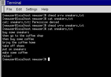 [newuser@localhost newuser]$ chmod u+rw sneakers.txt [newuser@localhost newuser]$ cat sneakers.txt buy some sneakers then go to the coffee shop then buy some coffee bring the coffee home take off shoes put on sneakers make some coffee relax! [newuser@localhost newuser]$ |