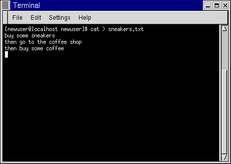 [newuser@localhost newuser]$ cat > sneakers.txt