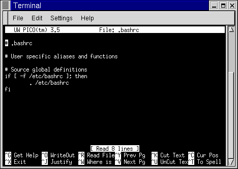 Now that we're prepared, we'll open .bashrc with Pico, a simplified text editor. (A text editor is a utility program that can create or modify files.) From an Xterm window, type: