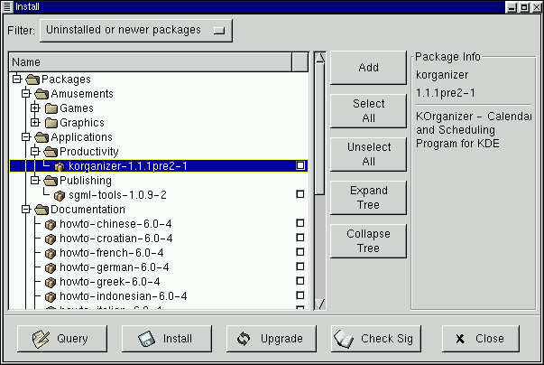 By clicking on the item, you'll find a brief description of the package in the Package Info panel of the Install window. To perform an installation or a query on the package, click inside the checkbox next to the package, then select the Install button. You can also query the item once it's checked; from within the Package Info window, you can also perform the installation (see Figure 7-10 in the section called Querying Packages for an example).