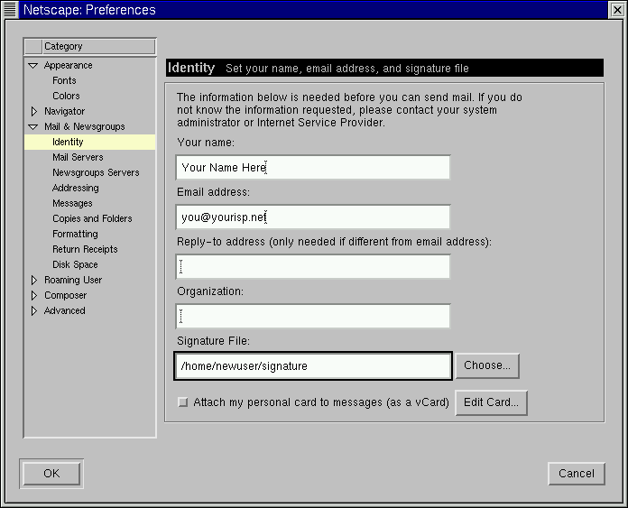 You can specify where you want your mail to be stored by either typing in the location in Local mail directory, or by clicking on the Choose button, and selecting a directory in the navigation window which opens. By default, mail will be stored in a directory in your user directory; if your name is newuser, for example, the path to the directory will be /home/newuser/nsmail.