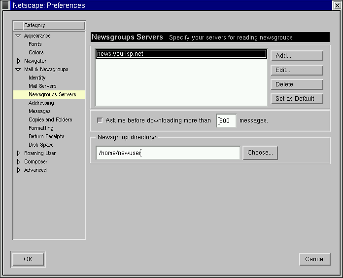 In the Newsgroups Servers category, enter the server name through which you can retrieve and post newsgroup messages (see Figure 7-10).