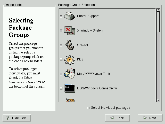 Some packages (such as the kernel and certain libraries) are required for every Red Hat Linux system and are not available to select or deselect. These base packages are selected by default.