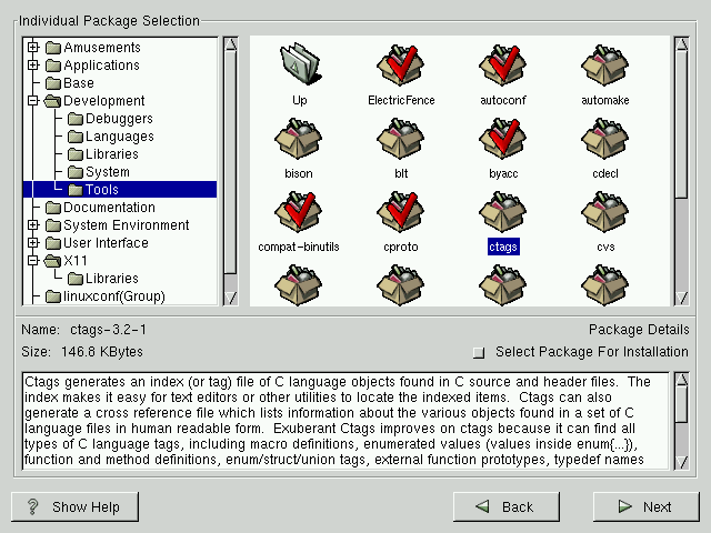 To select an individual package, double-click on it, or click on it once to highlight it and click on the Select Package For Installation button below. A red check mark will appear on any of the packages you have selected for installation.