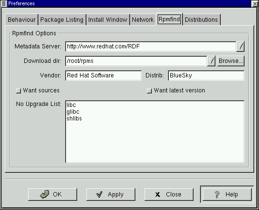 In Distribution Settings, you can set the options for choosing the most appropriate package out of the selections Rpmfind returns, as well as which mirror you would like to use. The higher the rating you indicate for your selection (as shown in Figure 7-9) the higher the priority it will receive; the lower rating, such as "-1," will specify that packages not be recommended.