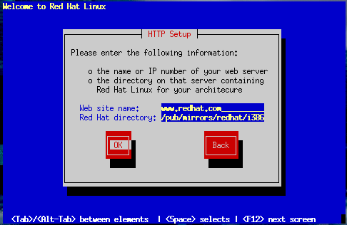 Enter the name or IP address of the HTTP site you are installing from, and the name of the directory there which contains the RedHat installation files for your architecture. For example, if the HTTP site contains the directory /pub/mirrors/redhat/i386/RedHat, enter /pub/mirrors/redhat/i386.