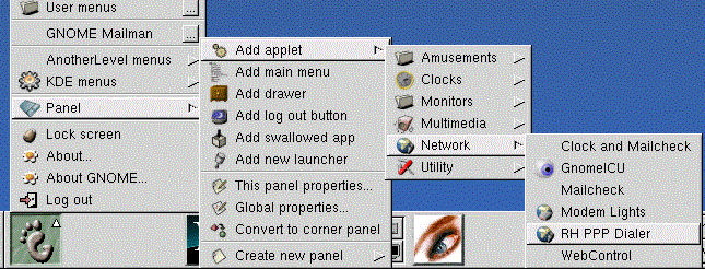 Once you have configured your PPP account, start RP3 (right-click on the Panel => Add applet => Network => RH PPP Dialer).
