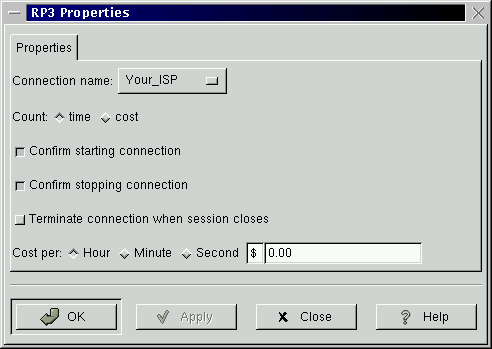 • Cost per: If you pay for Internet access by the hour, minute or second, you can specify the cost for your access here. When you're connected, your connection costs will then be reflected on the RP3 monitor.