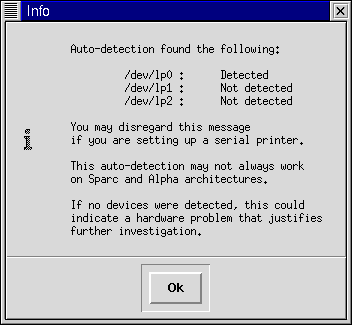 In our example, a parallel port printer was detected at /dev/lp0. Click on the OK button to continue.