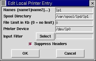 In the next dialog (see Figure 5-5), you can specify details about your printer, such as a name of the printer and its related spool directory, the location of the printer device and other options.