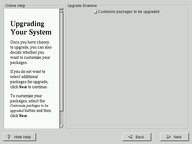 If you click Next and the Customize packages to upgrade button is not selected, your system will automatically begin the upgrade process (see the section called Upgrading Packages).