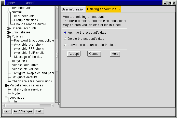 Linuxconf will prompt you to enter the new password. There is also a field called Confirmation where you will need to type the password again. This is to prevent you from mistyping the password. See the section called Adding a User Account for guidance on choosing a password. If you decide against changing the password, select Cancel. Once you have entered the new password select Accept.