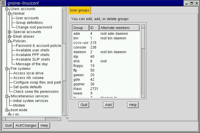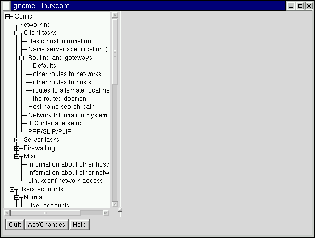 (Replace <host> with your system's hostname, of course.) You should see the main linuxconf page. Note that you will need to enter your system's root password to gain access beyond the first page.