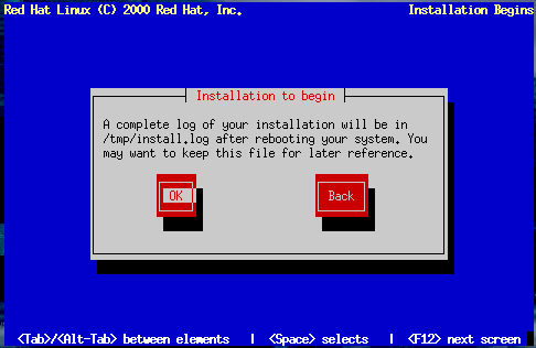 Figure 10-39 appears when the installation program is ready to format partitions and load software packages. The installation program names the log file (/tmp/install.log) for this Red Hat Linux installation. Select OK and press Space to continue.
