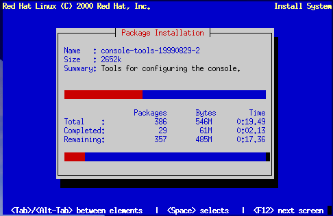 As each software package is installed, the top part of the Package Installation screen displays its name, size, and a summary description of its function.