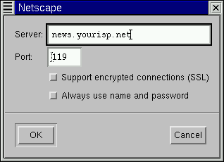 To begin, click on the Add button. In the dialog which opens (see Figure 7-11), enter the newsgroups server information supplied by your ISP.