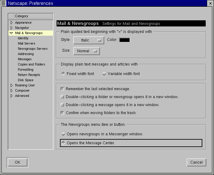 You can also select whether you want to view mail and news with a fixed width or variable width font. Selecting Fixed width font will preserve the display of fonts throughout messages and articles.