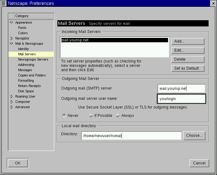 You can specify where you want your mail to be stored by either typing in the location in Local mail directory, or by clicking on the Choose button, and selecting a directory in the navigation window which opens. By default, mail will be stored in a directory in your user directory; if your name is newuser, for example, the path to the directory will be /home/newuser/nsmail.