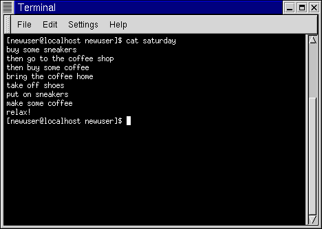 [newuser@localhost newuser]$ cat sneakers.txt home.txt > saturday
