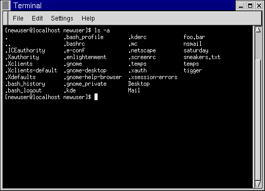 Quite a difference. When you added the -a option, you were specifying that you wanted to list all the files in the directory (see Figure 13-6).