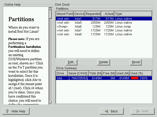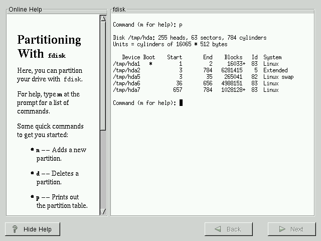 This section applies only if you chose to use fdisk to partition your system. If are not using fdisk, please skip to the section called Automatic Partitioning for automatic partitioning or the section called Partitioning Your System for partitioning with Disk Druid.