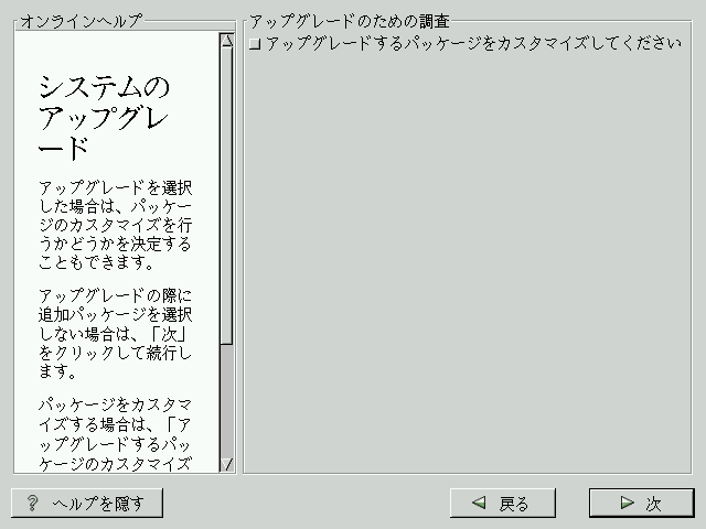 次に、システムのアップグレードをインストールプログラムに実行させるのか、またはアップグレードするパッケージを自分でカスタマイズするのかを選択します。 (図 5-2を参照してください)。