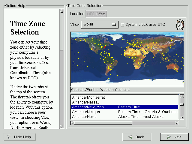From the interactive map, you can also click on a specific city, as indicated by the yellow dots; a red X will appear indicating your selection. You can also scroll through a list and choose your desired time zone.