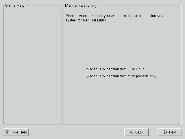 Das manuelle Partitionieren ermöglicht es Ihnen, Linux zu installieren und dabei Ihr(e) Laufwerk(e) selbst zu partitionieren. Falls Sie sich nicht sicher genug fühlen, um Ihr System selbst zu partitionieren, sollten Sie auf keinen Fall die Option zum manuellen Partitionieren auswählen, sondern stattdessen die Option zum automatischen Partitionieren. Dazu klicken Sie auf Zurück und wählen dann eine Installation der Klasse Workstation oder Server aus.