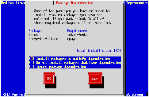 Viele der Software-Pakete können nur in Verbindung mit anderen Paketen oder Bibliotheken, die auf Ihrem System installiert sind, korrekt ausgeführt werden. Beispielsweise sind für viele der grafischen Systemadministrations-Tools die Pakete python und pythonlib erforderlich. Um sicherzustellen, dass alle Pakete zur Verfügung stehen, die Ihr System benötigt, überprüft Red Hat Linux diese Paketabhängigkeiten bei jeder Installation oder Deinstallation von Software-Paketen.