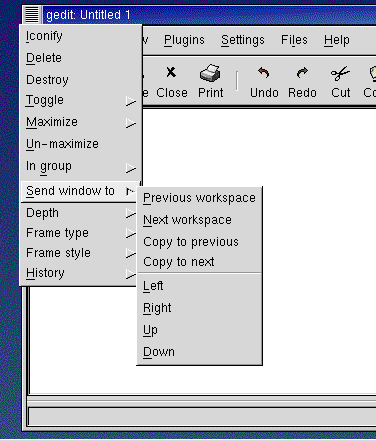 Wenn Sie beispielsweise GNOME und den Windowmanager Sawfish verwenden (ein Windowmanager verwaltet die Anzeige der Fenster auf Ihrem Bildschirm), können Sie ein Fenster von einem Desktop auf einen anderen Desktop verschieben, indem Sie auf die Titelleiste der Anwendung klicken und diese dann über den linken, rechten, oberen oder unteren Rand Ihres Bildschirms hinausziehen.