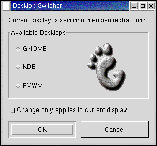 Vous pouvez modifier des environnements à l'aide de l'utilitaire Switchdesk (reportez-vous à la Figure 2-11). Que vous utilisiez GNOME, KDE ou AnotherLevel, vous pouvez sélectionner votre nouvel environnement dans Switchdesk, puis vous déconnecter. Lorsque vous redémarrez votre session, vous découvrez votre nouvel environnement.