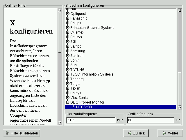 Xconfigurator, das Konfigurationstool für das X Window System, zeigt Ihnen zunächst eine Liste mit Bildschirmen zur Auswahl an. Sie können entweder den automatisch erkannten Bildschirm verwenden oder stattdessen selbst einen geeigneten anderen Bildschirm auswählen.
