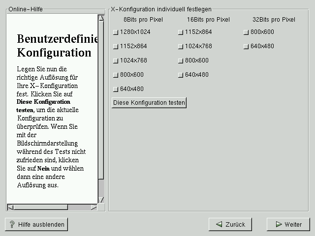Wenn Sie die X-Konfiguration benutzerdefiniert anpassen möchten, müssen Sie das Kontrollkästchen X-Konfiguration individuell festlegen aktivieren. In diesem Fall wird ein weiterer Bildschirm angezeigt, in dem Sie die gewünschte Auflösung auswählen können (siehe Abbildung 5-20). Auch jetzt erhalten Sie die Möglichkeit, die Konfiguration zu testen.