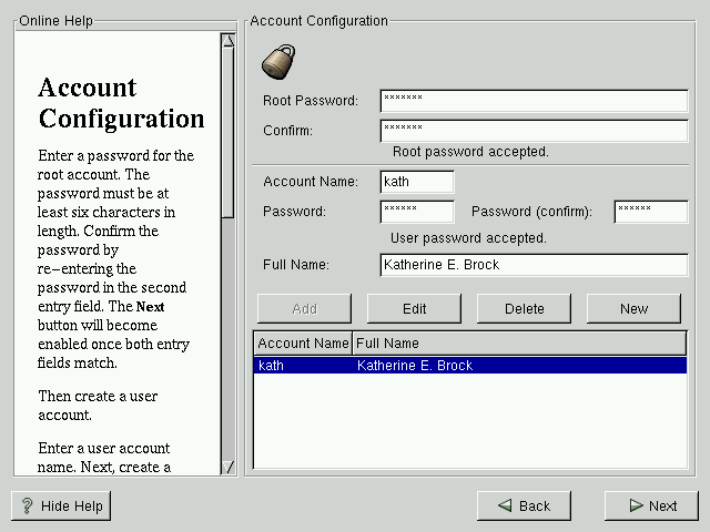 Entrez un nom de compte. Ensuite, entrez et confirmez un mot de passe pour ce compte utilisateur. Entrez le nom complet de l'utilisateur du compte, puis appuyez sur Entrée. Le système ajoute les informations du compte à la liste des comptes, puis efface les champs pour vous permettre de créer un nouvel utilisateur.