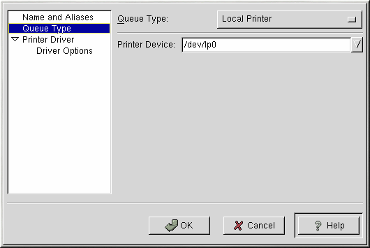 Inserite un nome univoco per la stampante nel campo Queue Name. Può essere un nome descrittivo. Potete anche creare alias per i nomi della stampante selezionando il pulsante Add accanto all'elenco Aliases. Fate riferimento alla la sezione Creazione di un alias per maggiori informazioni sugli alias. I nomi delle stampanti e gli alias non possono contenere spazi e devono iniziare con una lettera dell'alfabeto maiuscola o minuscola.Fate clic su Queue Type nella parte sinistra del menu e selezionate Local Printer dal menu Queue Type. Inserite anche il nome della stampante nel campo Printer Device o selezionatelo dal menu a tendina come mostrato nella Figura 13-3.