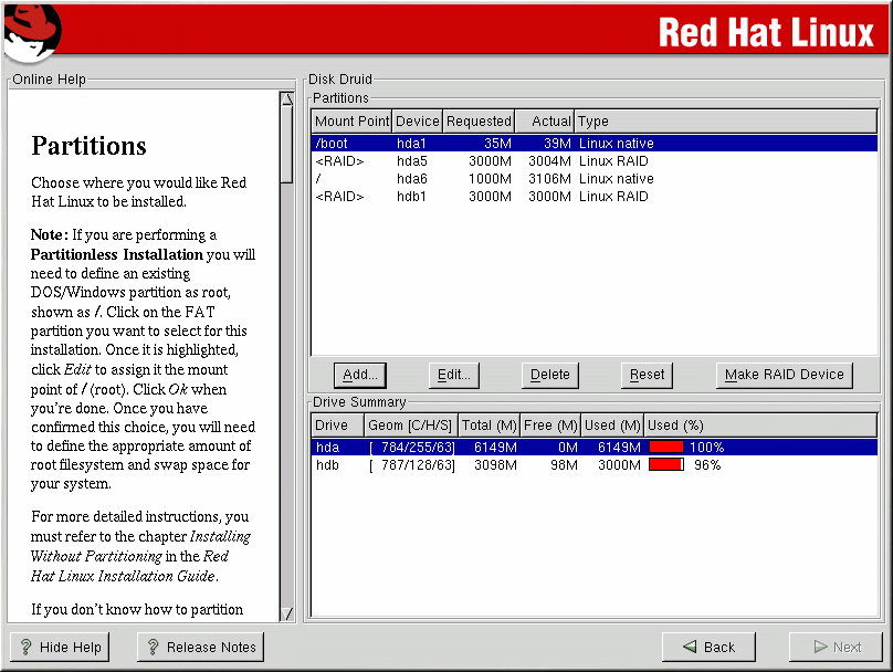 Il RAID software può essere configurato durante l'installazione di Red Hat Linux oppure durante un'installazione kickstart. Potete utilizzare sia fdisk che Disk Druid per creare la configurazione del RAID, ma in questa sezione ci concentreremo soprattutto sull'uso di Disk Druid.