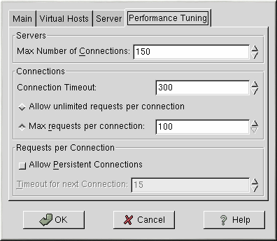 Stellen Sie Max requests per connection auf die maximale Anzahl Anforderungen ein, die für eine ständige Verbindung zugelassen sind. Der Standardwert ist 100, was sich für die meisten Situation eignet. Diese Option entspricht der Anweisung MaxRequestsPerChild.