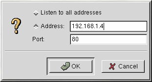 Verwenden Sie Available addresses, um die Ports zu definieren, auf denen Apache die eingehenden Anfragen annimmt. Diese Option entspricht der Anweisung Listen in httpd.conf. Standardmäßig konfiguriert Red Hat Apache auf die Ports 80 und 8080 für nicht verschlüsselte Web-Mitteilungen. Klicken Sie auf Add, um zusätzliche Ports zu bestimmen. Es erscheint ein Fenster wie in Abbildung 11-2 angegeben. Wählen Sie entweder Listen to all addresses für alle IP-Adressen auf dem definierten Port oder geben Sie im Feld Address eine bestimmte Adresse an, über die der Server Verbindungen annimmt. Geben Sie nur eine IP-Adresse pro Portnummer an. Wenn Sie mehr als eine IP-Adressen für dieselbe Portnummer angeben möchten, erstellen Sie einen Eintrag für jede IP-Adresse. Wenn möglich, verwenden Sie eine IP-Adresse statt einen Domänennamen, um einen DNS-Abfragefehler zu vermeiden. Weitere Informationen über Themen in Bezug auf DNS und Apache finden Sie unter http://httpd.apache.org/docs/dns-caveats.html. Die Eingabe eines (*) im Feld Address entspricht der Auswahl von Listen to all addresses. Wenn Sie auf die Schaltfläche Edit drücken, wird das gleiche Fenster wie bei Add angezeigt, mit Ausnahme der Felder für den gewählten Eintrag. Wenn Sie einen Eintrag löschen möchten, wählen Sie ihn aus und klicken Sie auf die Schaltfläche Delete.