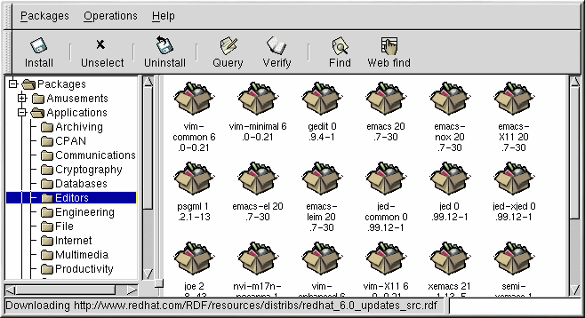 Durch einfaches Klicken auf einige Buttons können Sie Pakete installieren, aktualisieren oder entfernen. In gleicher Weise können Sie ein oder mehrere Pakete gleichzeitig anfragen und verifizieren. Da Gnome-RPM in GMONE integriert ist, können Sie in GNOME File Manager Pakete installieren, anfragen und verifizieren.