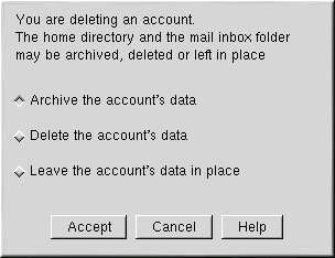 Das Datum gibt an, wann der Account gelöscht wurde. Die nachfolgende Zahl ist die ID des Prozesses, der die Löschung vorgenommen hat. Wenn Sie zum ersten Mal mit dieser Option einen Benutzer-Account löschen, wird das Verzeichnis oldaccounts automatisch in dem Verzeichnis erstellt, in dem alle Ihre Benutzerverzeichnisse liegen.