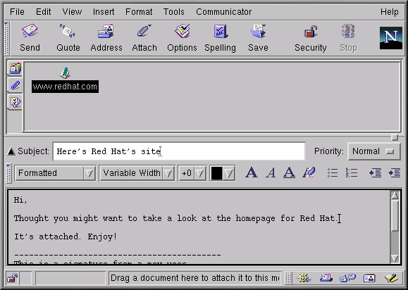 Sie können Dateien von Ihrem Desktop oder aus Ihrem Dateimanager auf gleiche Weise wie URLs aus Navigator ziehen. Klicken Sie einfach mit der Maustaste auf die gewünschte Datei, und ziehen Sie diese dann in das Feld für Anlagen in Ihrer Nachricht. |