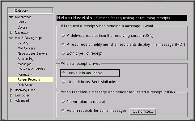 Um die Einstellungen für Empfangsbestätigungen vorzunehmen, gehen Sie zu Edit => Preferences => Mail & Newsgroups => Return Receipts. Im daraufhin geöffneten Dialogfeld (siehe Abbildung 7-17) können Sie festlegen, ob Sie Empfangsbestätigungen für gesendete und erhaltene Mails senden möchten.