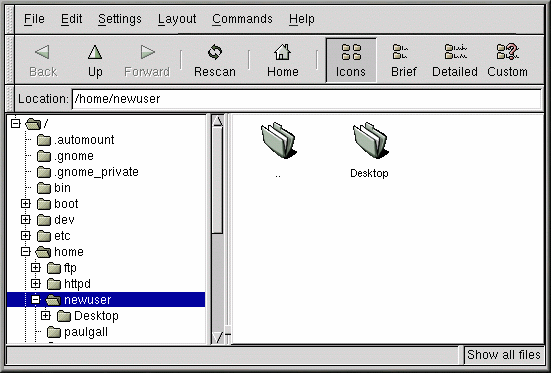 Als Dateimanager wird eine Anwendung mit der Bezeichnung GNU Midnight Commander oder GMC verwendet. GMC ist die an GNOME angepasste Version des verbreiteten Dateimanagers Midnight Commander. Über den Dateimanager erfahren Sie mehr in Abschnitt namens Der GNOME-Dateimanager in Kapitel 11 oder im GNOME Benutzerhandbuch auf der Website http://www.gnome.org |
