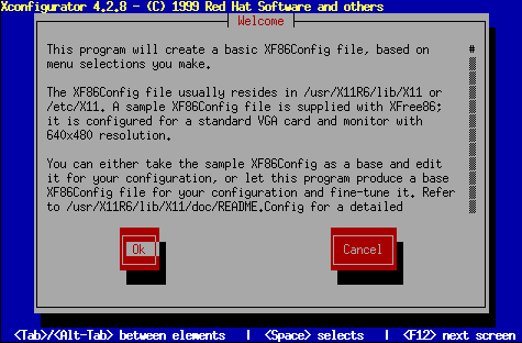 Um Xconfigurator verwenden zu können, müssen Sie sich als Root anmelden. Geben Sie an einem Shell Prompt Xconfigurator ein, um die Anwendung zu starten. Der Begrüßungsbildschirm sieht ähnlich aus wie in Abbildung 13-3.