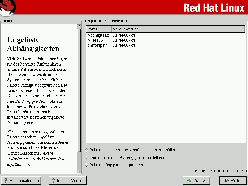Einige Pakete (wie zum Beispiel der Kernel und bestimmte Bibliotheken) sind für jedes Red Hat Linux System erforderlich und können nicht selektiert oder deselektiert werden. Diese Pakete sind bereits standardmäßig ausgewählt. |