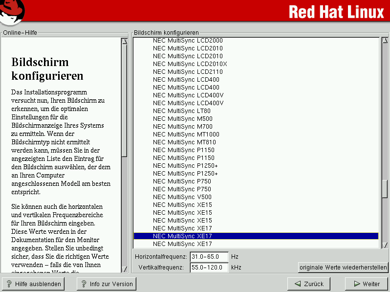 Wenn Ihr Bildschirm nicht in der Liste aufgeführt ist, wählen Sie den am besten geeigneten generischen Bildschirm aus. Bei der Auswahl eines generischen Bildschirms schlägt Xconfigurator Frequenzbereiche für die horizontale und vertikale Bildwiederholrate vor. Diese Werte sind normalerweise in der Dokumentation aufgeführt, die Ihrem Bildschirm beilag, oder sind beim Hersteller Ihres Monitors erhältlich. Um sicherzustellen, dass die korrekten Werte verwendet werden, sollten Sie in der Dokumentation zu Ihrem Bildschirm nachschlagen.