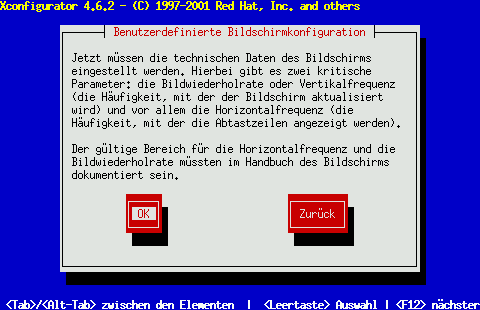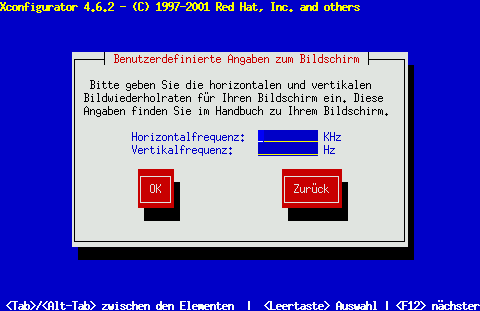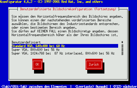 Wenn Sie Benutzerdefiniert auswählen, fordert Xconfigurator Sie auf, den Horizontalfrequenzbereich und die Bildwiederholrate Ihres Bildschirms auszuwählen. (Diese Informationen können Sie normalerweise der Dokumentation zu Ihrem Bildschirm entnehmen, Sie können sie aber auch vom Händler oder Hersteller des Bildschirms beziehen.)
