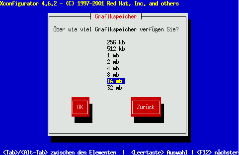 Falls Sie sich nicht sicher sind, über wie viel Speicher Ihre Karte verfügt, müssen Sie die Dokumentation heranziehen, die Ihrer Grafikkarte beilag. Wenn Sie einen Wert für den Speicher angeben, der den tatsächlich vorhandenen Speicher übersteigt, wird Ihre Karte hierdurch nicht beschädigt. Allerdings ist es in diesem Fall möglich, dass der XFree86-Server nicht richtig gestartet wird.