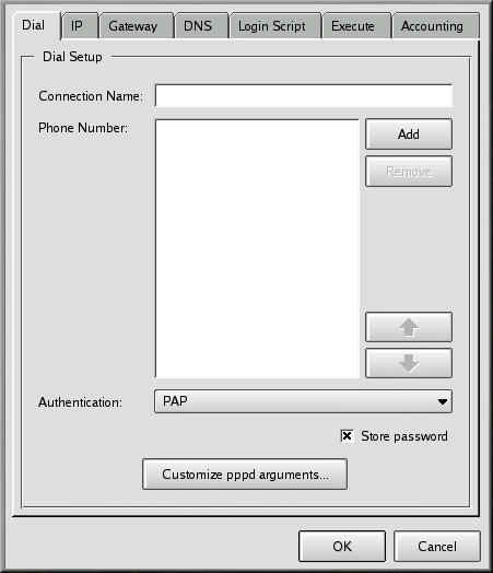 You can also customize options you want to pass to pppd in the Edit pppd arguments field, by clicking on the Customize pppd Arguments button.