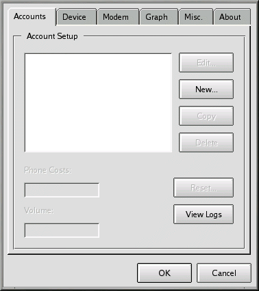 Type the password for the root account when it's requested. The opening dialog for Kppp will be "grayed out," because you haven't created an account yet (see Figure 6-15).
